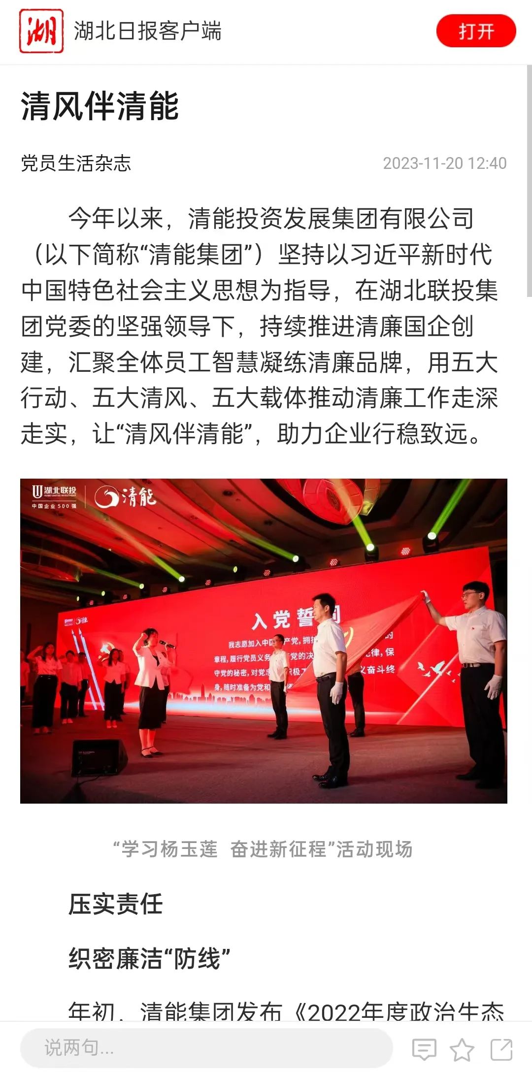 今年以來,聯(lián)投·清能投資發(fā)展集團有限公司(以下簡稱“清能集團”)堅持以習(xí)近平新時代中國特色社會主義思想為指導(dǎo),在湖北聯(lián)投集團黨委的堅強領(lǐng)導(dǎo)下,持續(xù)推進清廉國企創(chuàng)建,匯聚全體員工智慧凝練清廉品牌,用五大行動、五大清風(fēng)、五大載體推動清廉工作走深走實,讓“清風(fēng)伴清能”,助力企業(yè)行穩(wěn)致遠。