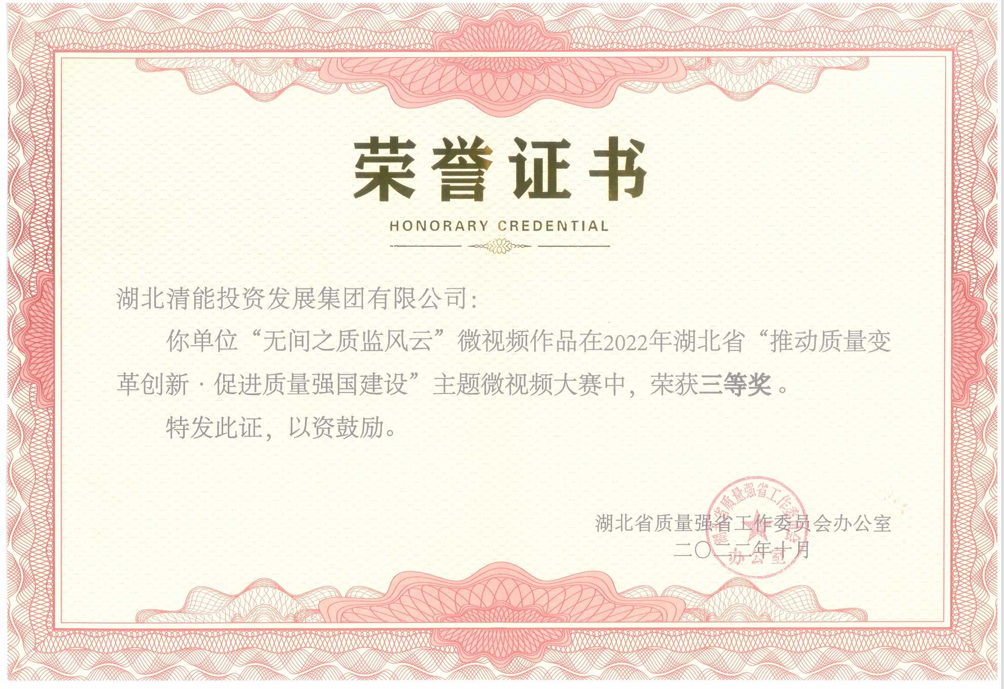 湖北省“推動質量變革創新 促進質量強國建設”主題微視頻三等獎